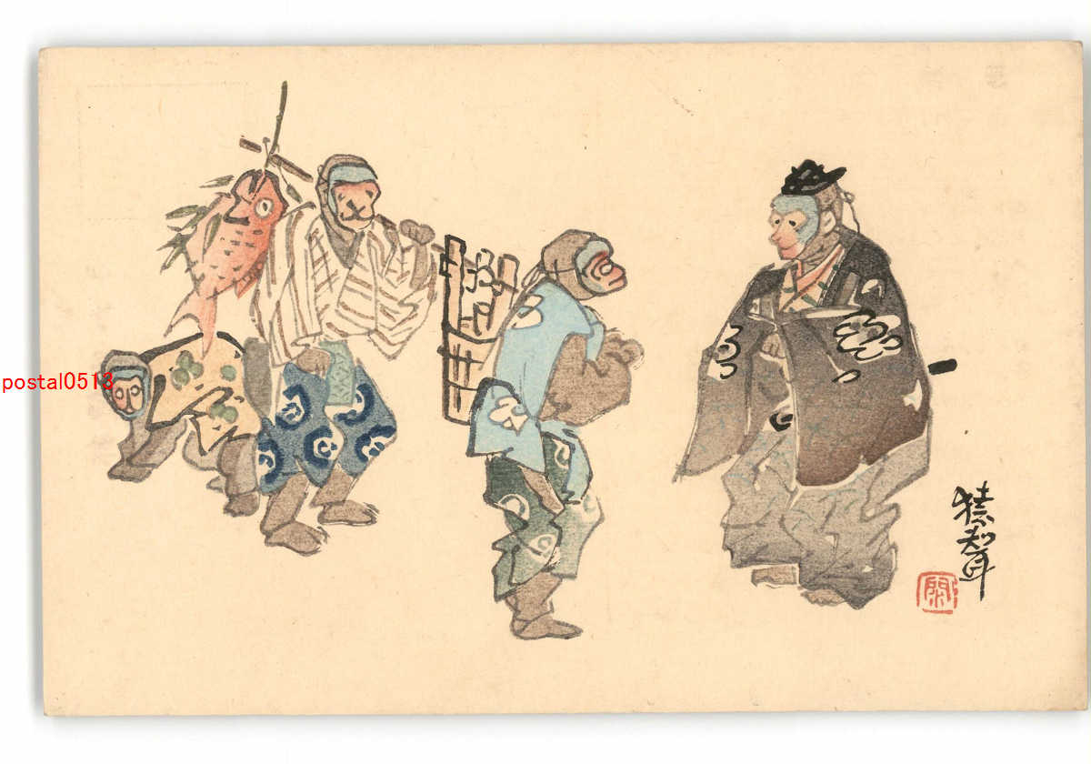 趣味人絵葉書 木版アート 八代嘉助 狂言猿智 *傷み有り
