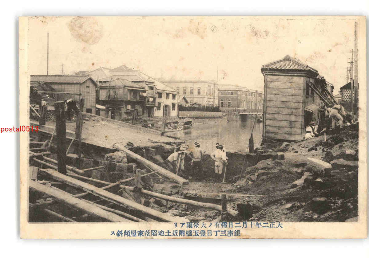東京 大正2年10月2日稀有の大豪雨あり 銀座三丁目豊玉橋附近土地陥落家屋傾斜す *傷み有り