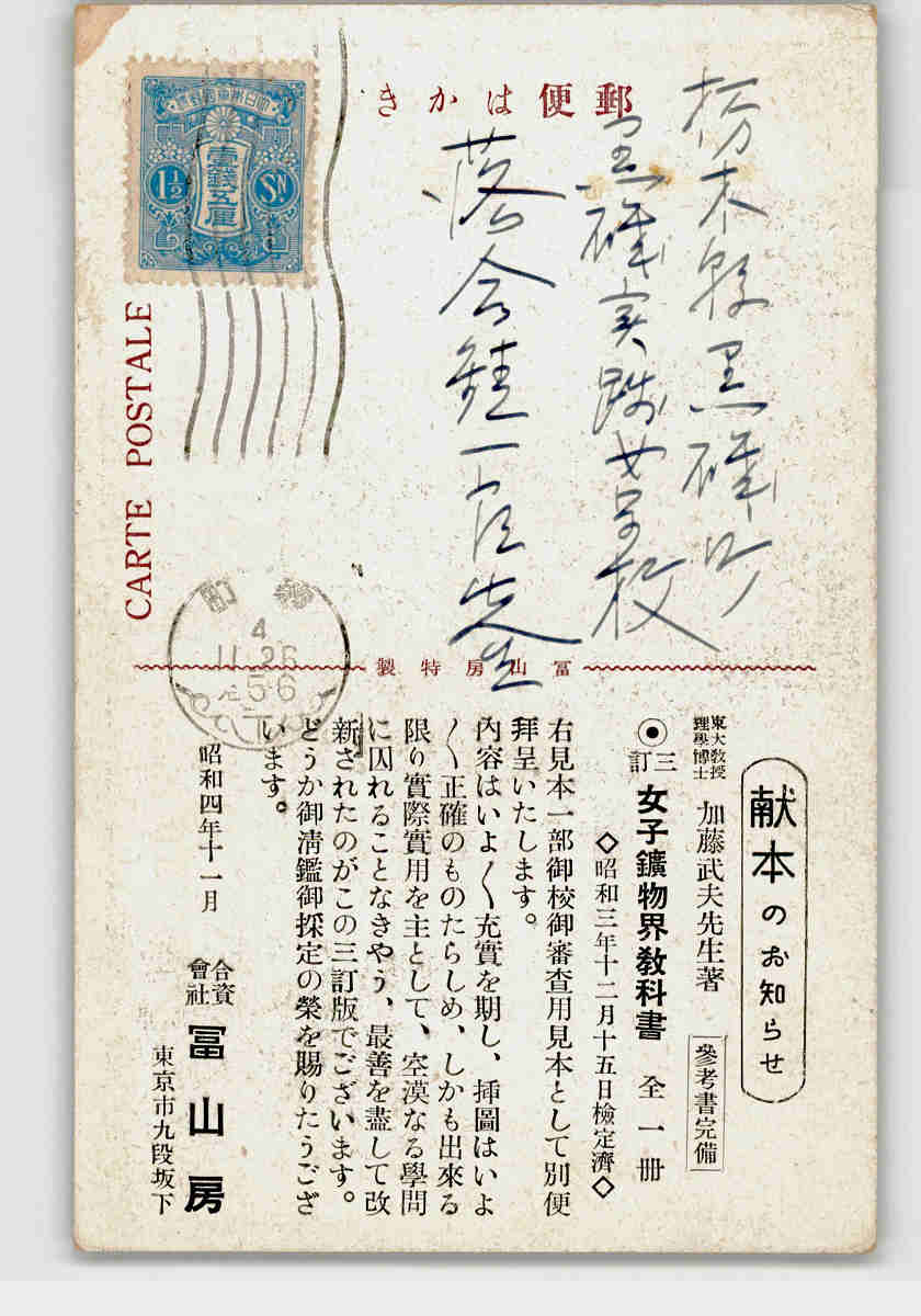 広告絵葉書 女子鉱物界教科書 挿絵 *傷み有り