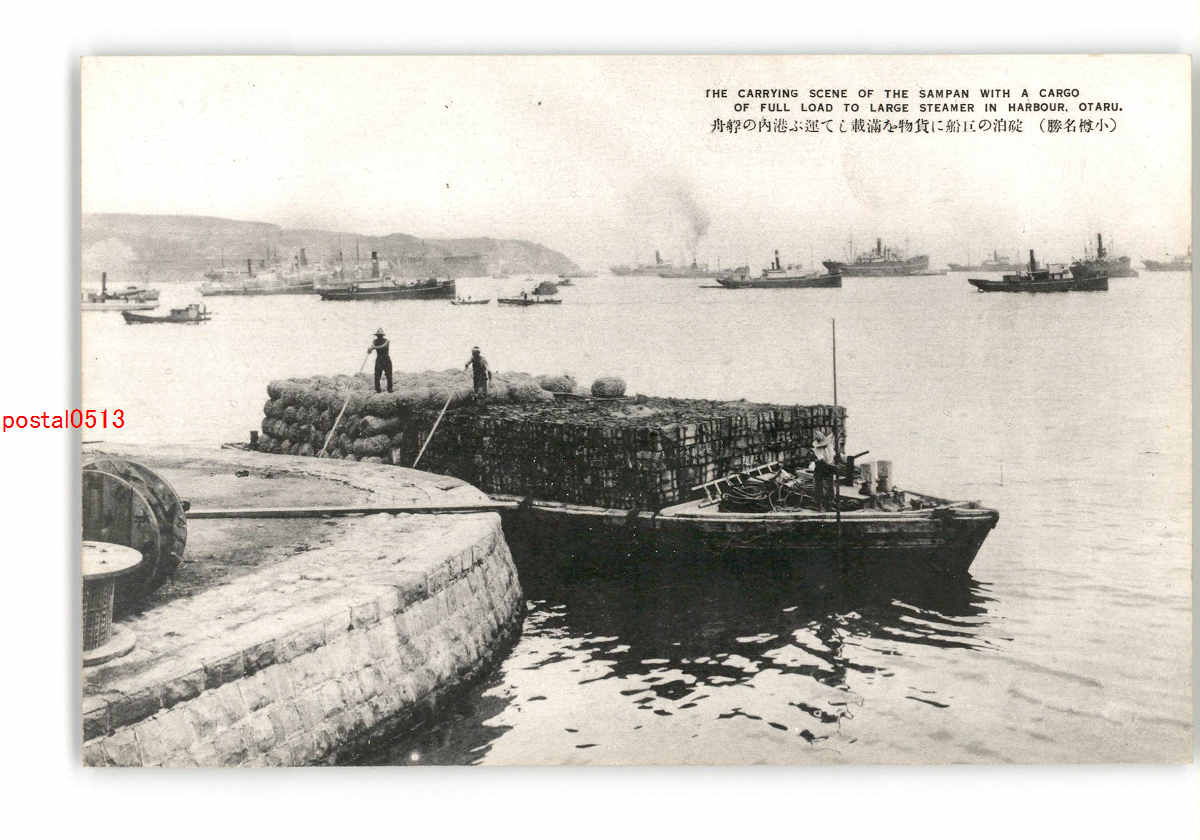 北海道 小樽名勝 淀泊の巨船に貨物を満載して運ぶ港内の艀舟 *傷み有り