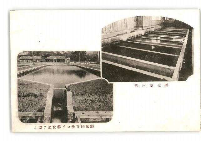福島 会津養魚場 孵化室内部 鱒児飼育池より孵化室を望む *傷み有り