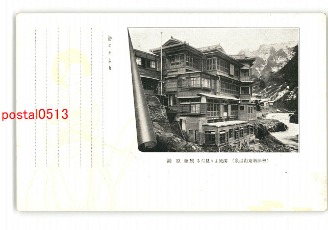 福島 会津新東山温泉 渓流より見たる旅館 原滝 *傷み有り