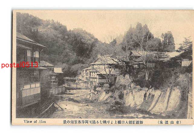 福島 東山温泉 新瀧旅館入口橋上より眺むる湯川両岸各旅館の景