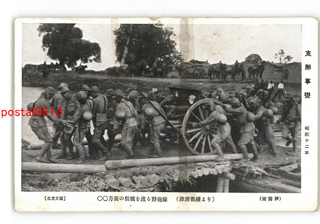 満州 支那事変 昭和12年 北支方面 〇〇方面の仮橋を渡る野砲隊 津浦戦線より *傷み有り