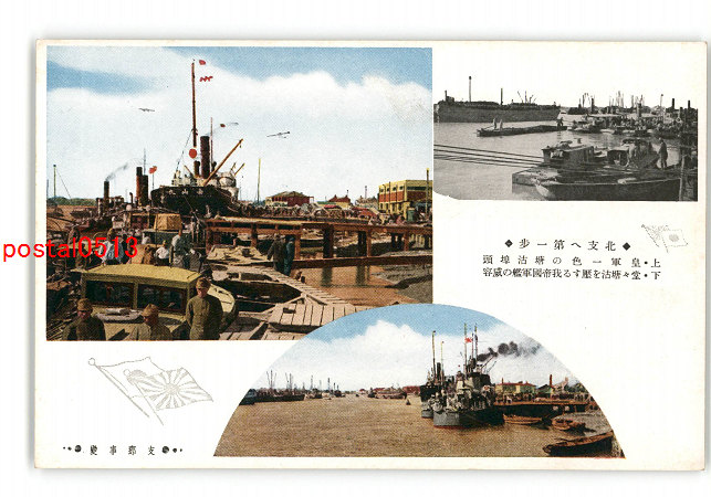 満州 支那事変 北支へ第一歩 皇軍一色の塘沽埠頭 堂々塘沽を圧する我帝国軍艦の偉容 *傷み有り