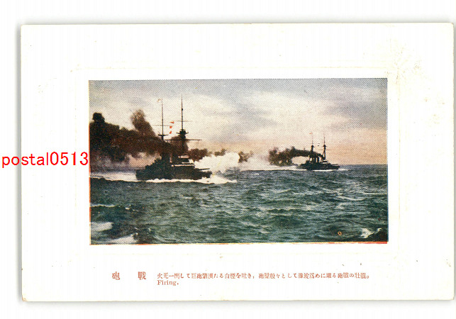 軍艦 砲戦 火光一閃して巨砲蒙漠たる白煙を吐き砲聲殷々として海波為めに躍る砲戦の壮観 *傷み有り