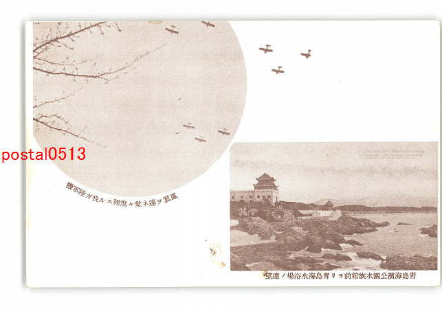 満州 青島海浜公園水族館前より青島海水浴場の遠望 鳳翼を連ね堂々飛翔する我が陸軍機 *傷み有り