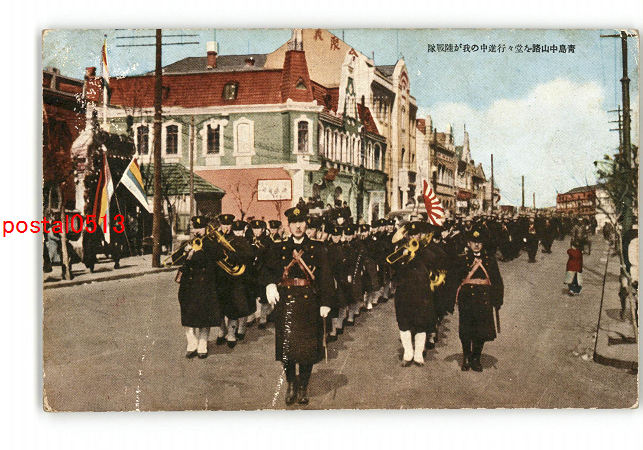 満州 青島中山路を堂々行進中の我が陸戦隊 *傷み有り