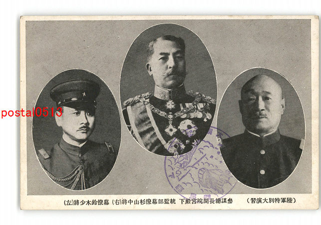 陸軍特別大演習 参謀総長閑院宮殿下 統監部幕僚杉山中将 右 幕僚鈴木少将 左 *傷み有り