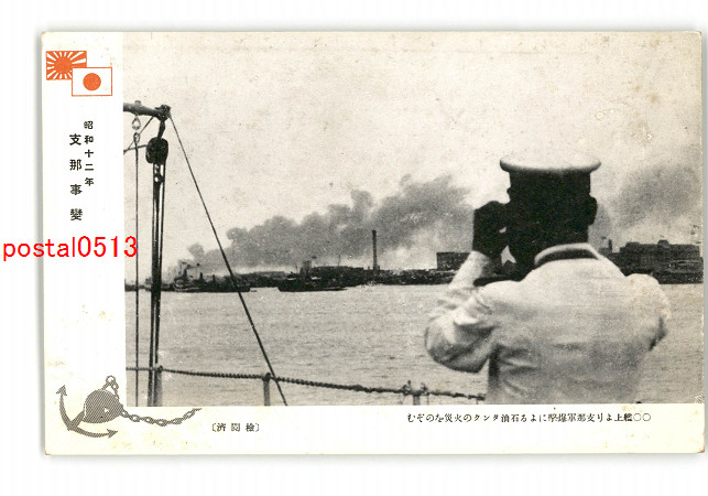 満州 昭和12年 支那事変 〇〇艦上より支那軍爆撃による石油タンクの火災をのぞむ *傷み有り