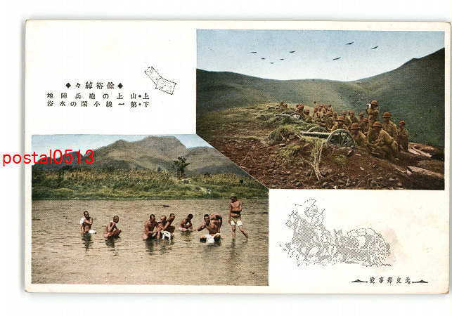 満州 北支那事変 余裕綽々 上 山上の砲兵陣地 下 第一線小閑の水浴 *傷み有り