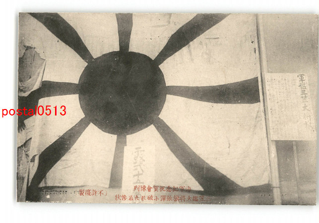 海軍紀念祝賀会陳列 三笠艦大将旗敵弾小破れたる惨状 *傷み有り