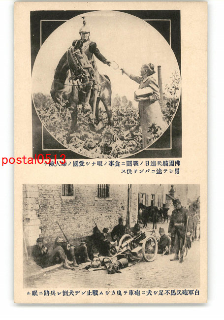 世界の戦争 仏国騎兵食事の暇ない婦人険を冐して途にパンを供す *傷み有り