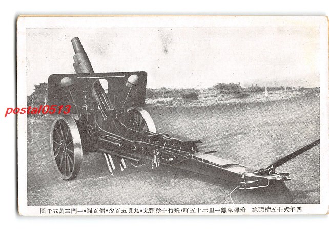 4年式15榴弾砲 着弾距離1里25町 飛行10秒弾丸 9貫500匁 價100円 1門3萬千円 *傷み有り