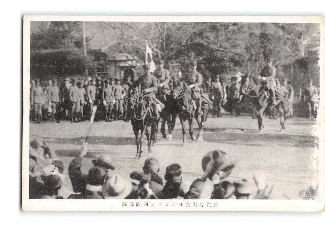 営門を出発せんとする西岡部隊 *傷み有り