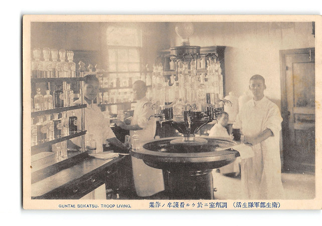 衛生部軍隊生活 調剤室に於ける看護卒の作業 *傷み有り