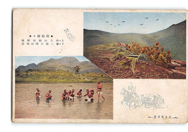 満州 北支那事変 余裕綽々 上 山上の砲兵陣地 下 第一線小閑の水浴 *裏無地 *傷み有り