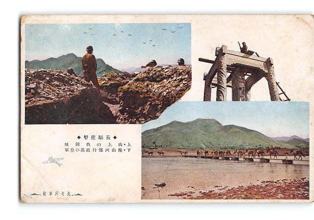 満州 北支那事変 長駆進撃 上 山上の我陣地 下 幾山河強行前進の皇軍 *傷み有り