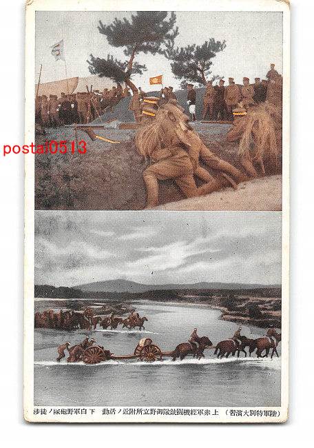陸軍特別大演習 上 赤軍経機関銃隊御野立所付近の活動 下 白軍野砲隊の徒渉 *傷み有り
