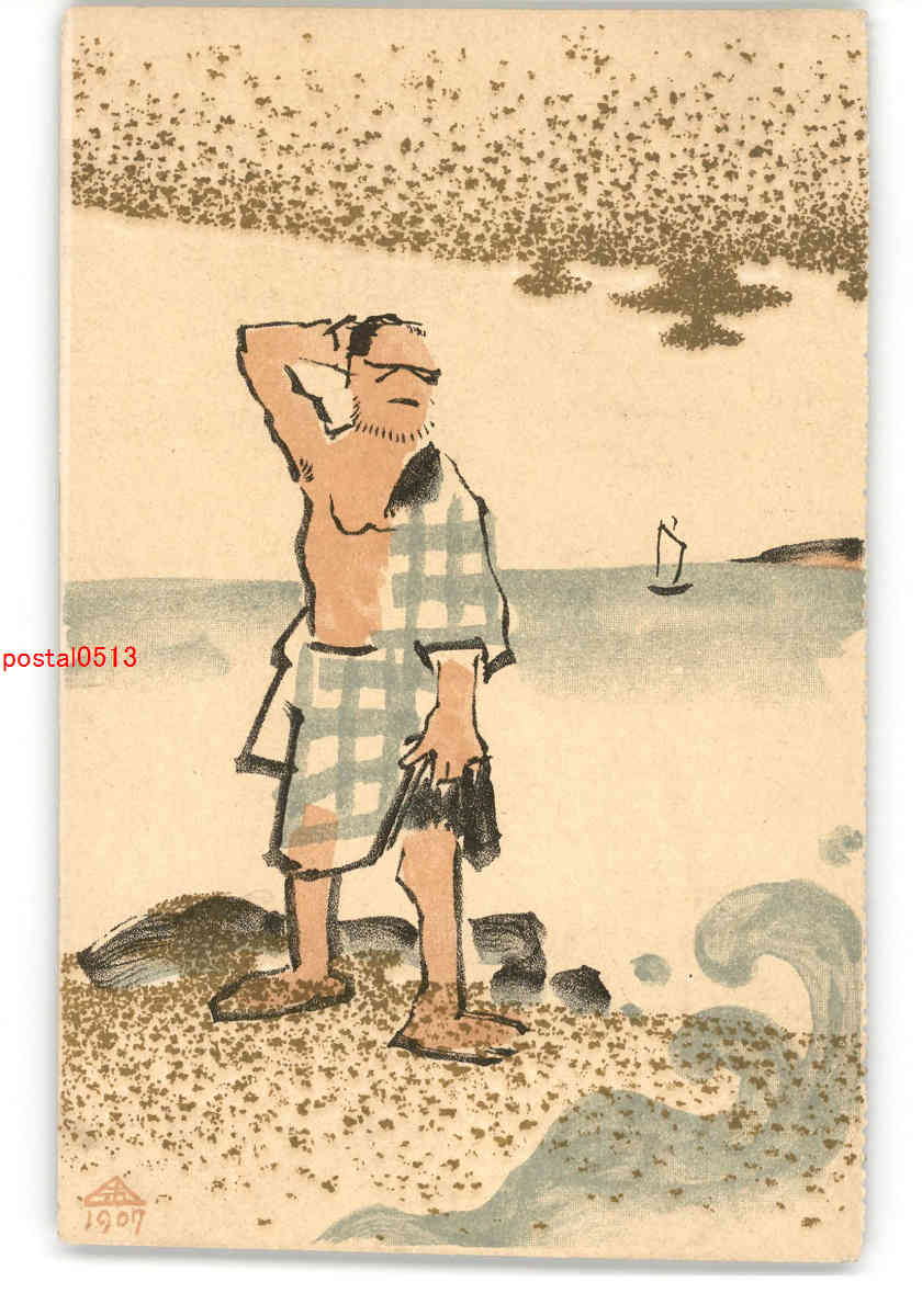 小杉未醒 アート絵葉書 海辺の男性 *傷み有り