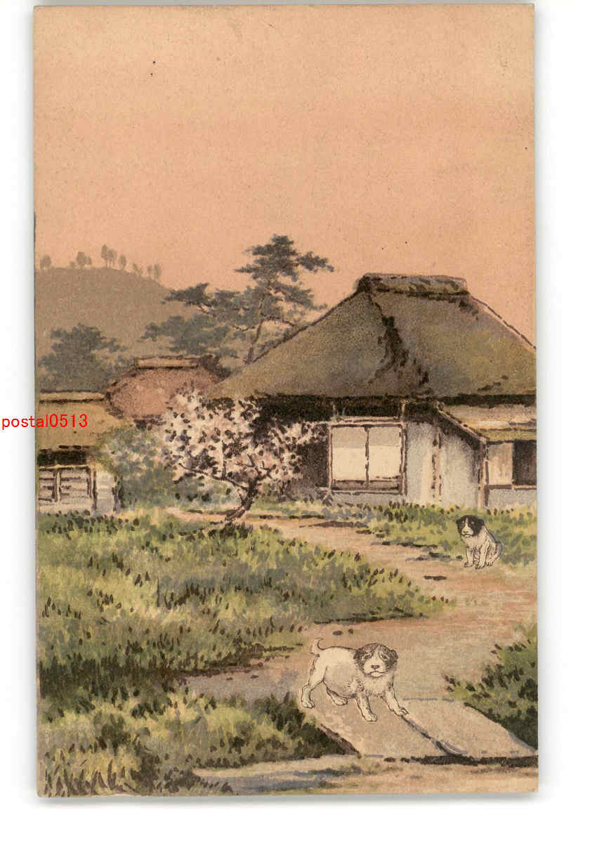 犬絵葉書 田舎の犬と家屋 *傷み有り
