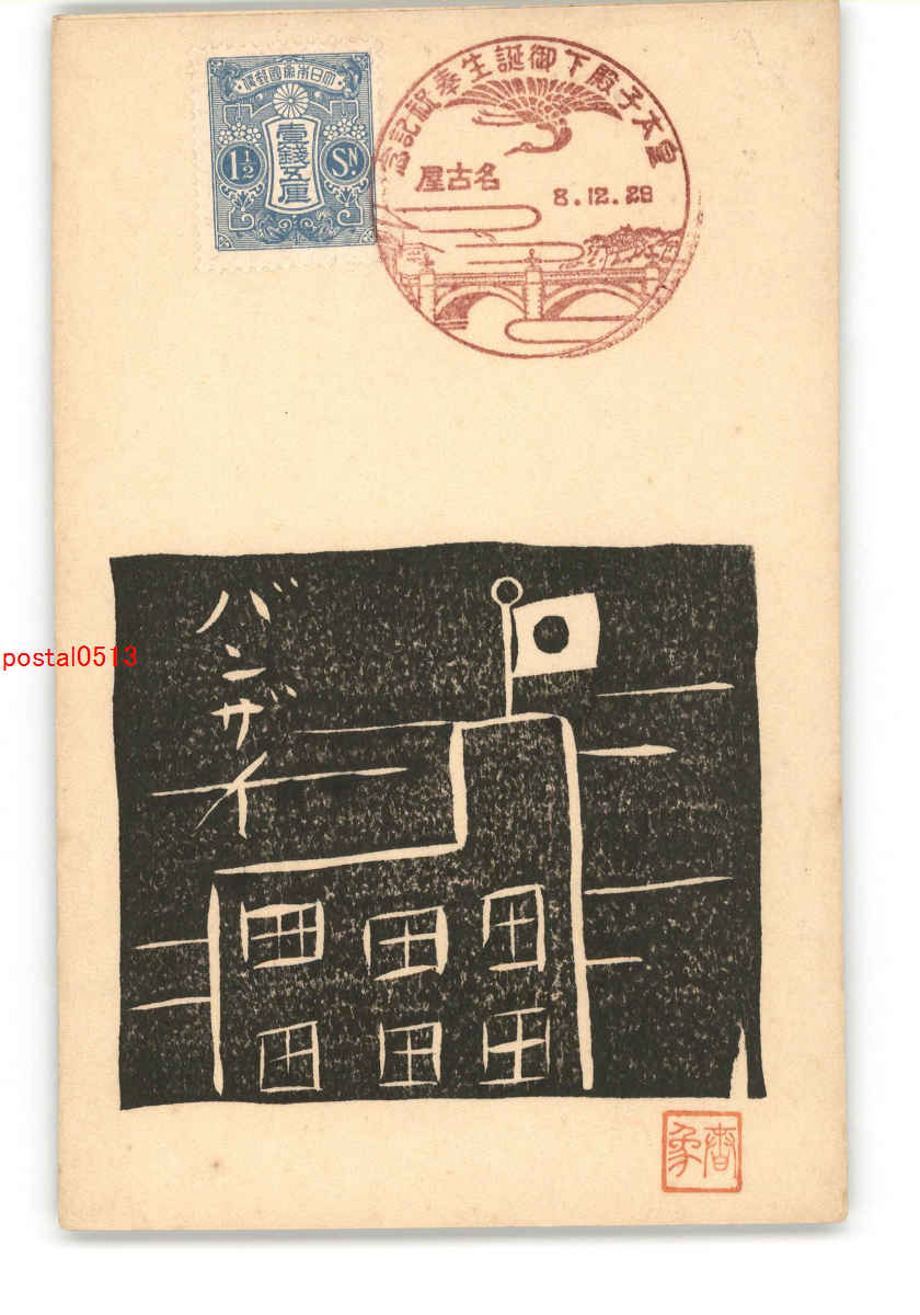 趣味人絵葉書 木版アート 皇太子殿下御誕生記念 ビルの上の日の丸 *傷み有り