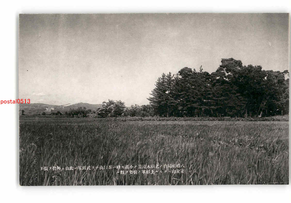 八幡社境内の老樹木遠景の小高き峰は茶臼山なり武田軍は此山に陣営を張り *傷み有り