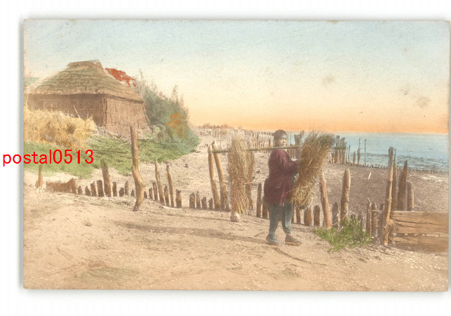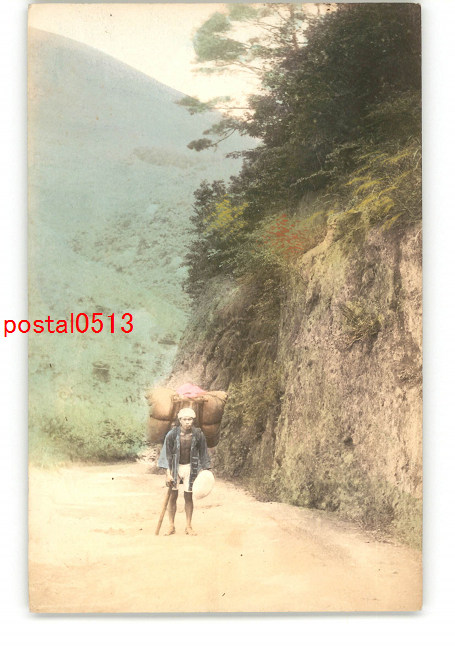 荷物を担いで歩く人 手彩色 *傷み有り