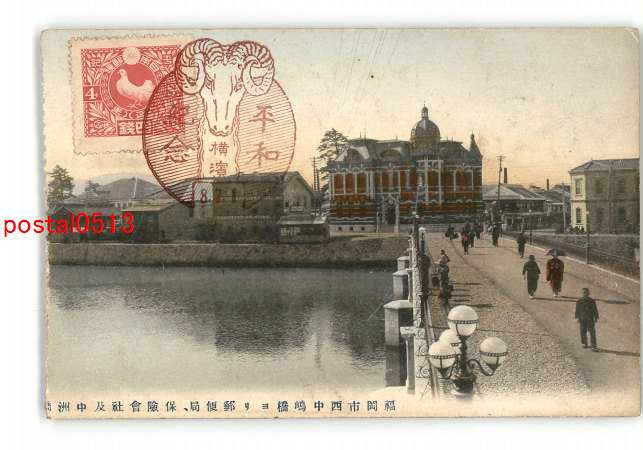 福岡 手彩色 福岡市西中島橋より郵便局、保険会社及中洲橋 *傷み有り