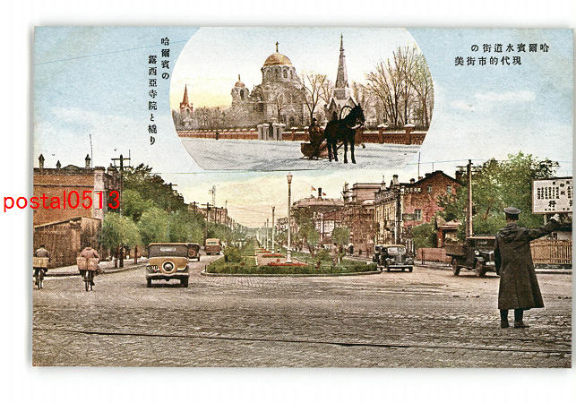 満州 哈爾賓水道街 現代的市街美 哈爾賓の露西亜寺院と橇り *傷み有り