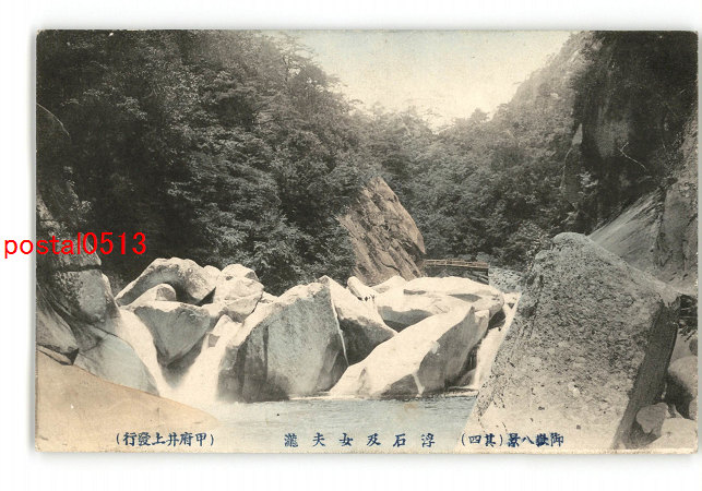 山梨 手彩色 御嶽八景 その4 浮石及女夫滝 *傷み有り