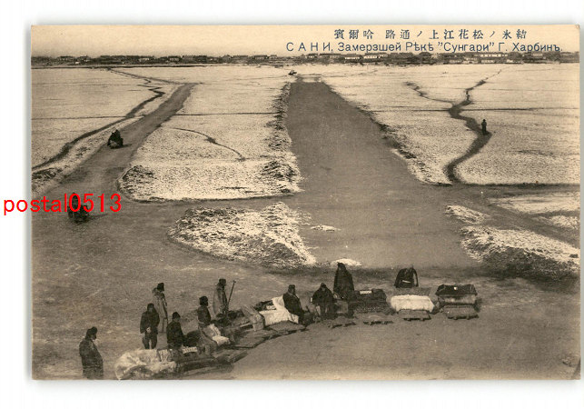 満州 結氷の松花江上の通路 哈爾浜 *傷み有り