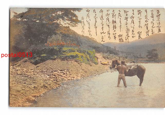 馬を川で洗う男性 手彩色 実逓便エンタイア *傷み有り