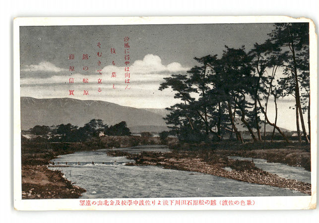 佐渡 景色の佐渡 越の松原石田川下流より佐渡中学校及金北山の遠望 *傷み有り
