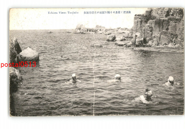 福井 岩底深く棲息せる鮑を採取の東尋坊海女 *傷み有り
