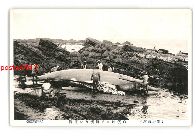 千葉 安房白浜 白浜沖にて捕獲せし巨鯨 *傷み有り
