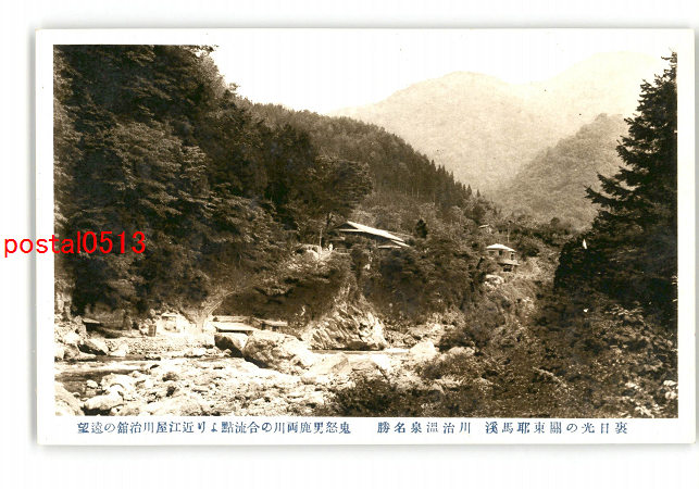 栃木 裏日光の関東耶馬渓 川治温泉名勝 鬼怒男鹿両川の合流点より近江屋川治館遠望 *傷み有り