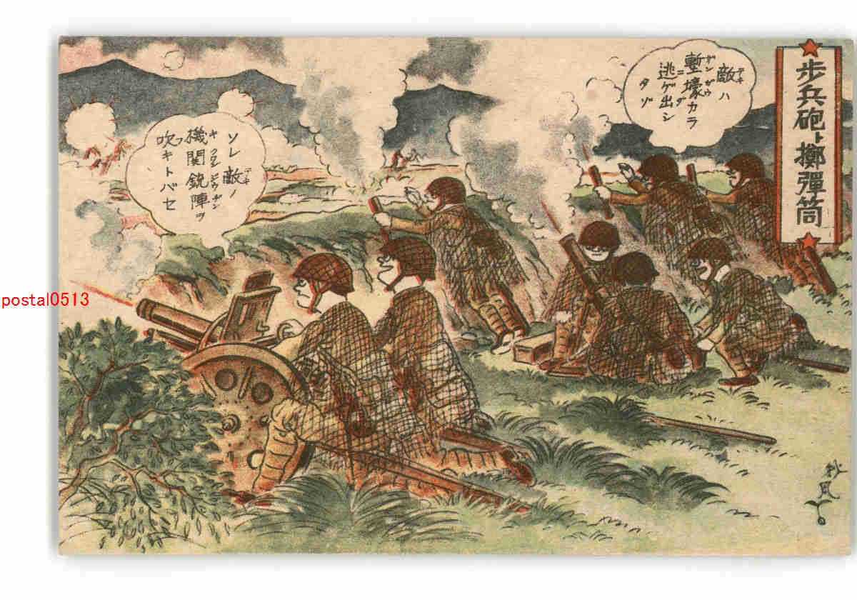 軍隊漫画アート絵葉書 歩兵砲と擲弾筒 *傷み有り