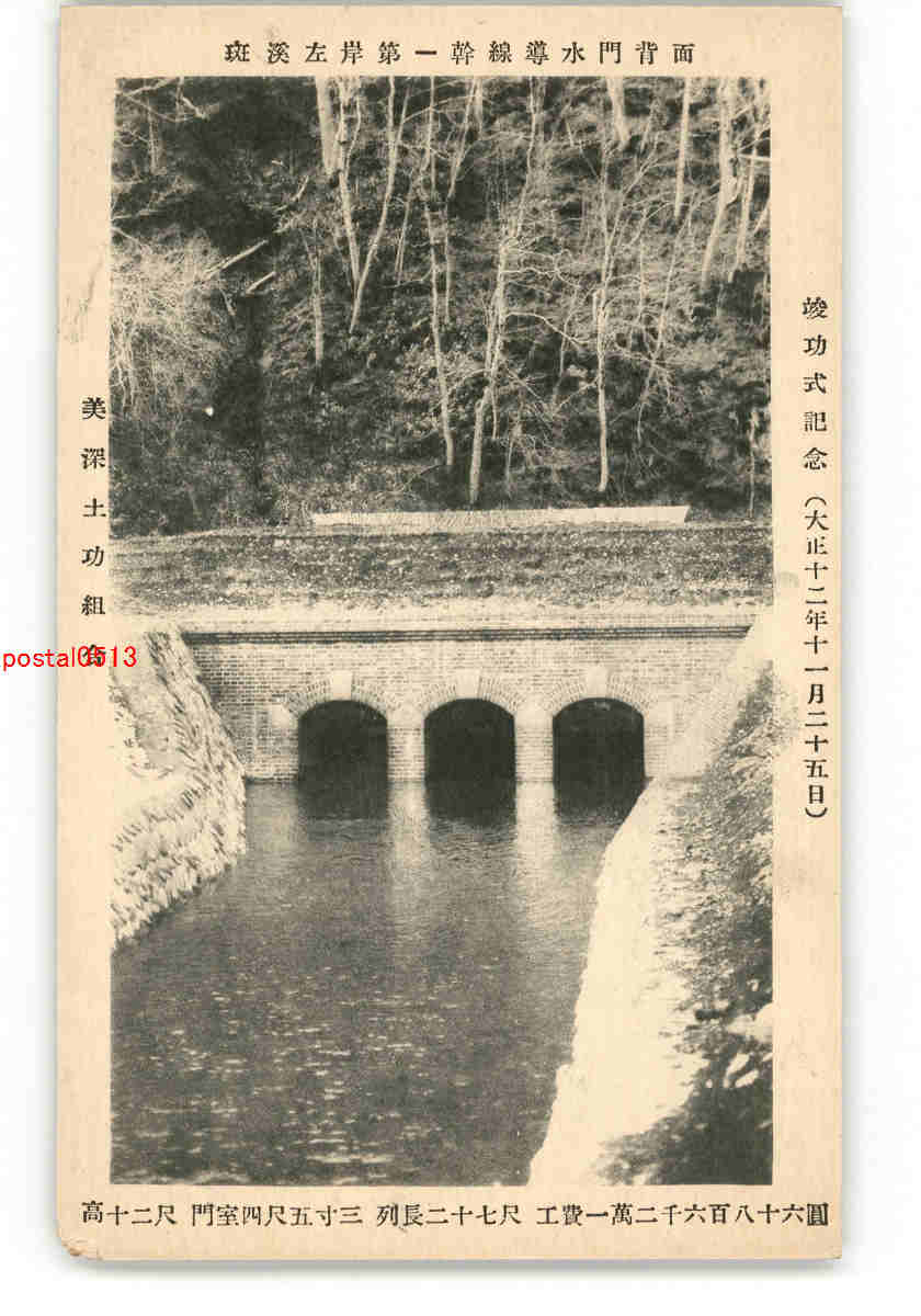 北海道 斑渓左岸第一幹線導水門背面 竣功式記念 大正12年11月25日 *傷み有り
