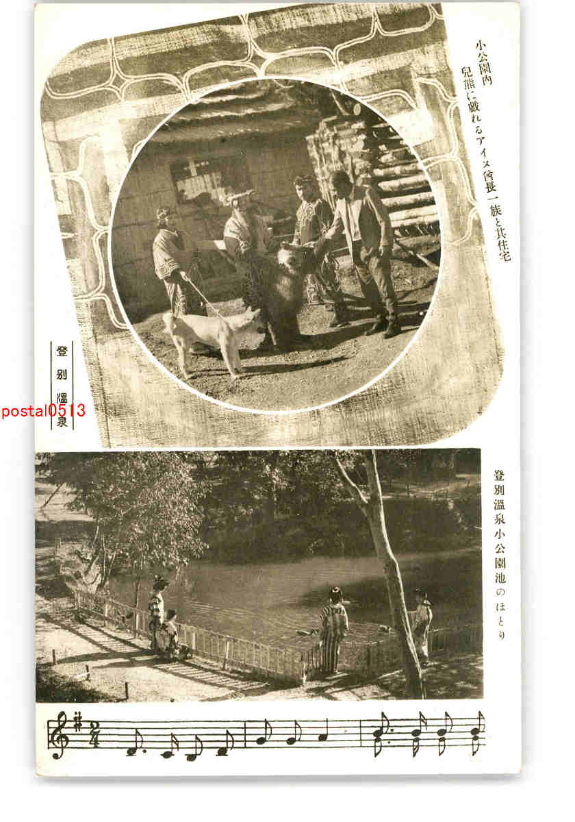 北海道 登別温泉 小公園内 児熊と犬とアイヌ酋長一族とその住宅 登別温泉小公園池 *傷み有り