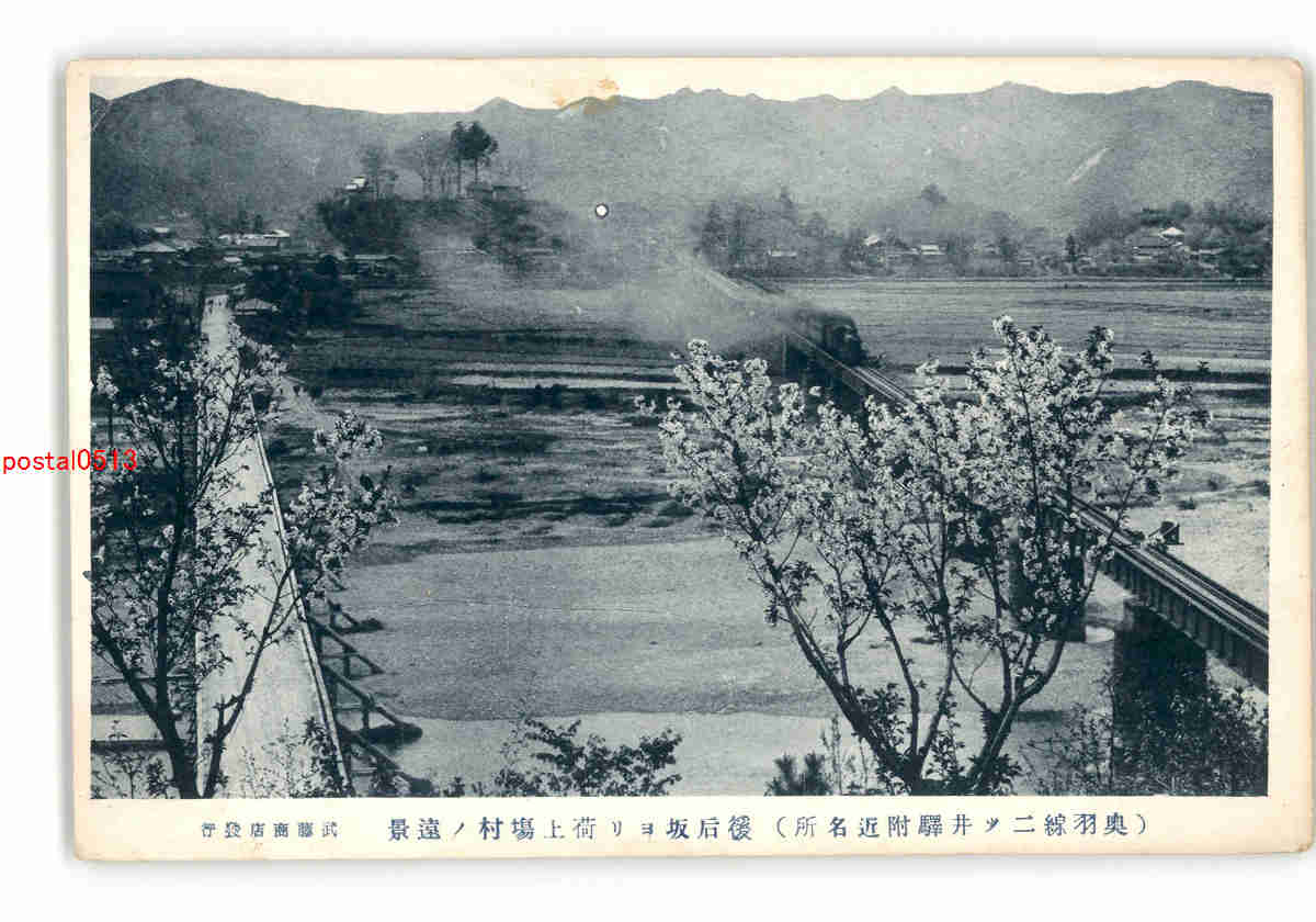 秋田 奥羽線二ツ井駅付近名所 徯后坂より荷上場村の遠景 *傷み有り
