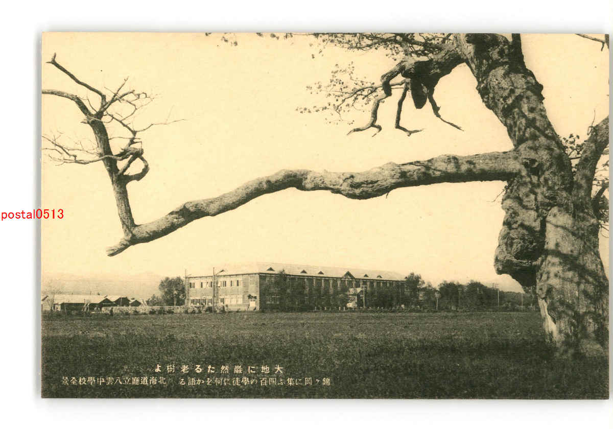 北海道 大地に厳然たる老樹よ 錦ヶ岡に集ふ400の学徒に何をか語る 八雲中学校全景 *傷み有り