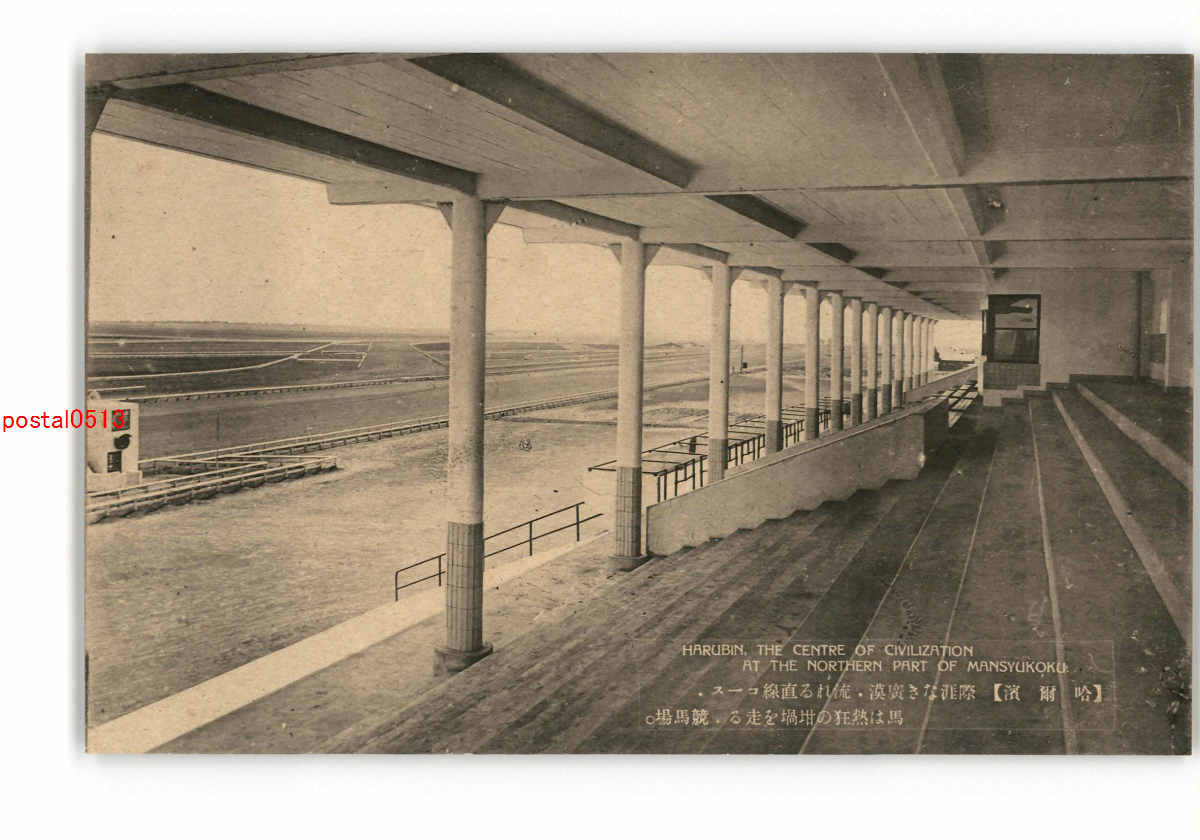 満州 哈爾浜 際涯なき広漠 流れる直線コース 馬は熱狂の坩堝堝を走る 競馬場 *アルバム跡傷み有り