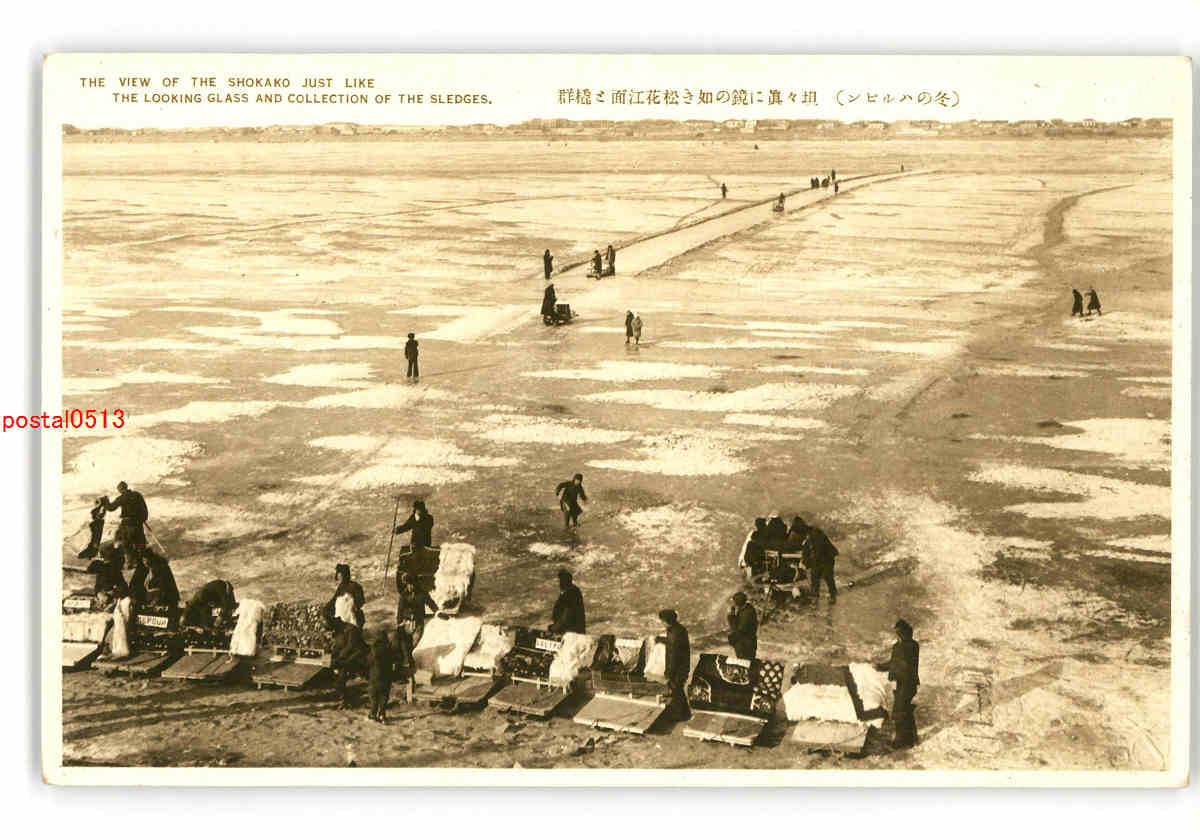 満州 冬のハルビン 坦々真に鏡の如き松花江面と橇群 *傷み有り