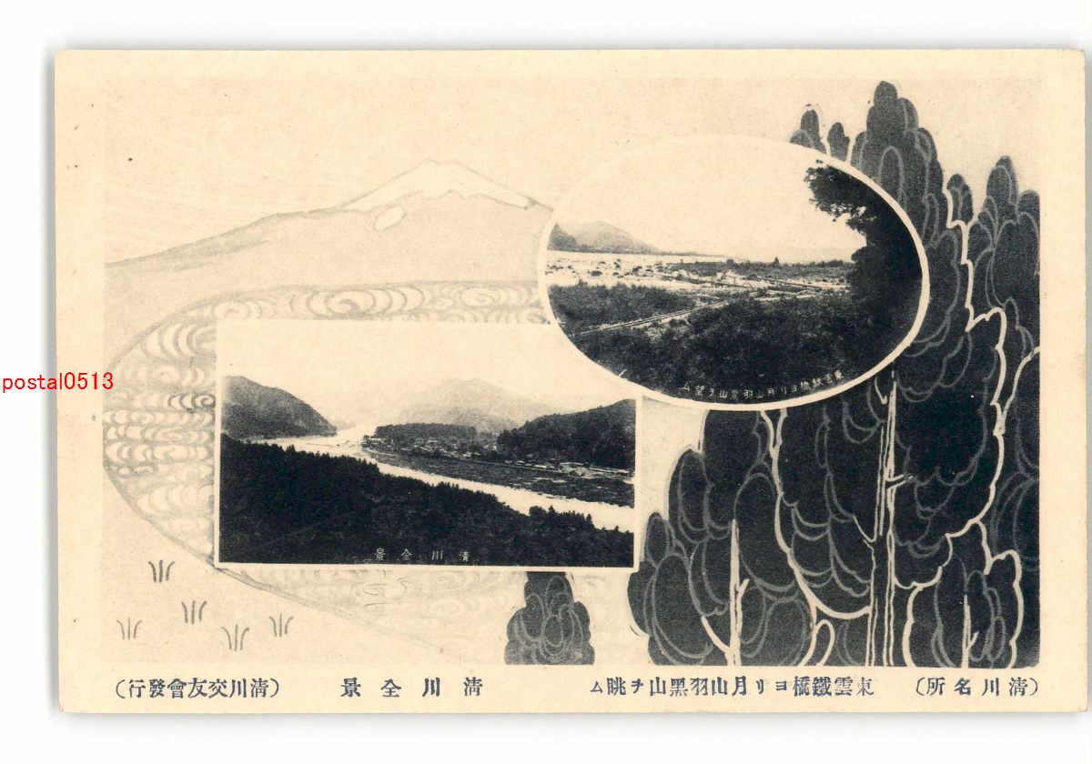 山形? 清川名所 東雲鉄橋より月山羽黒山を眺む 清川全景 *傷み有り