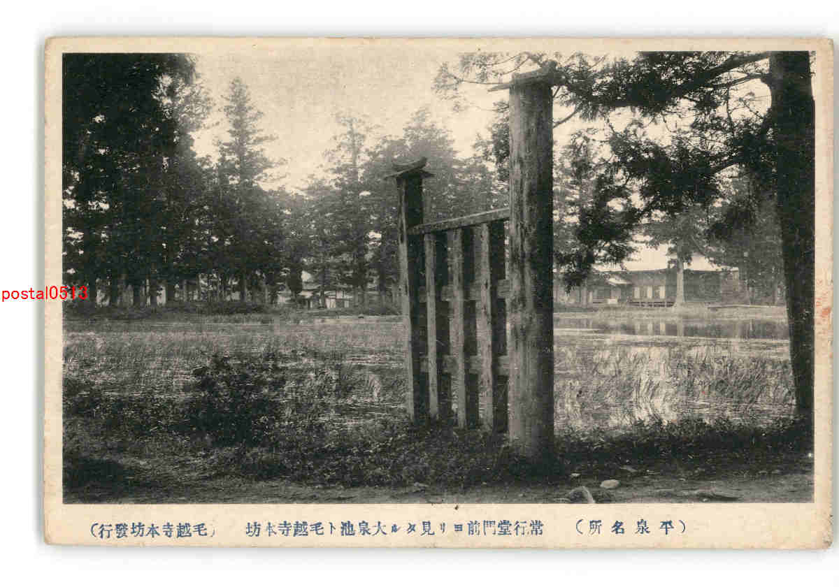 平泉名所 常行堂門前より見たる大泉池と毛越寺本坊 *傷み有り