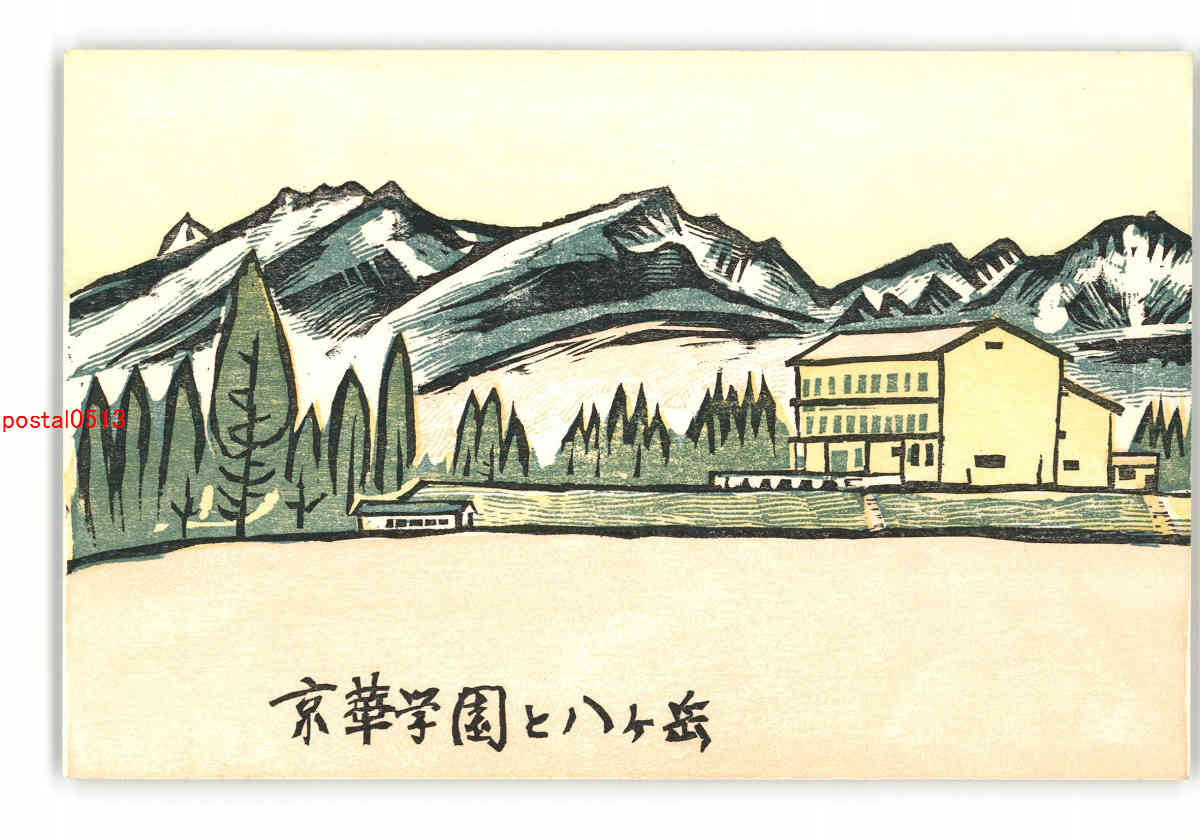 京華学園アート絵葉書 校舎と八ヶ岳 *傷み有り