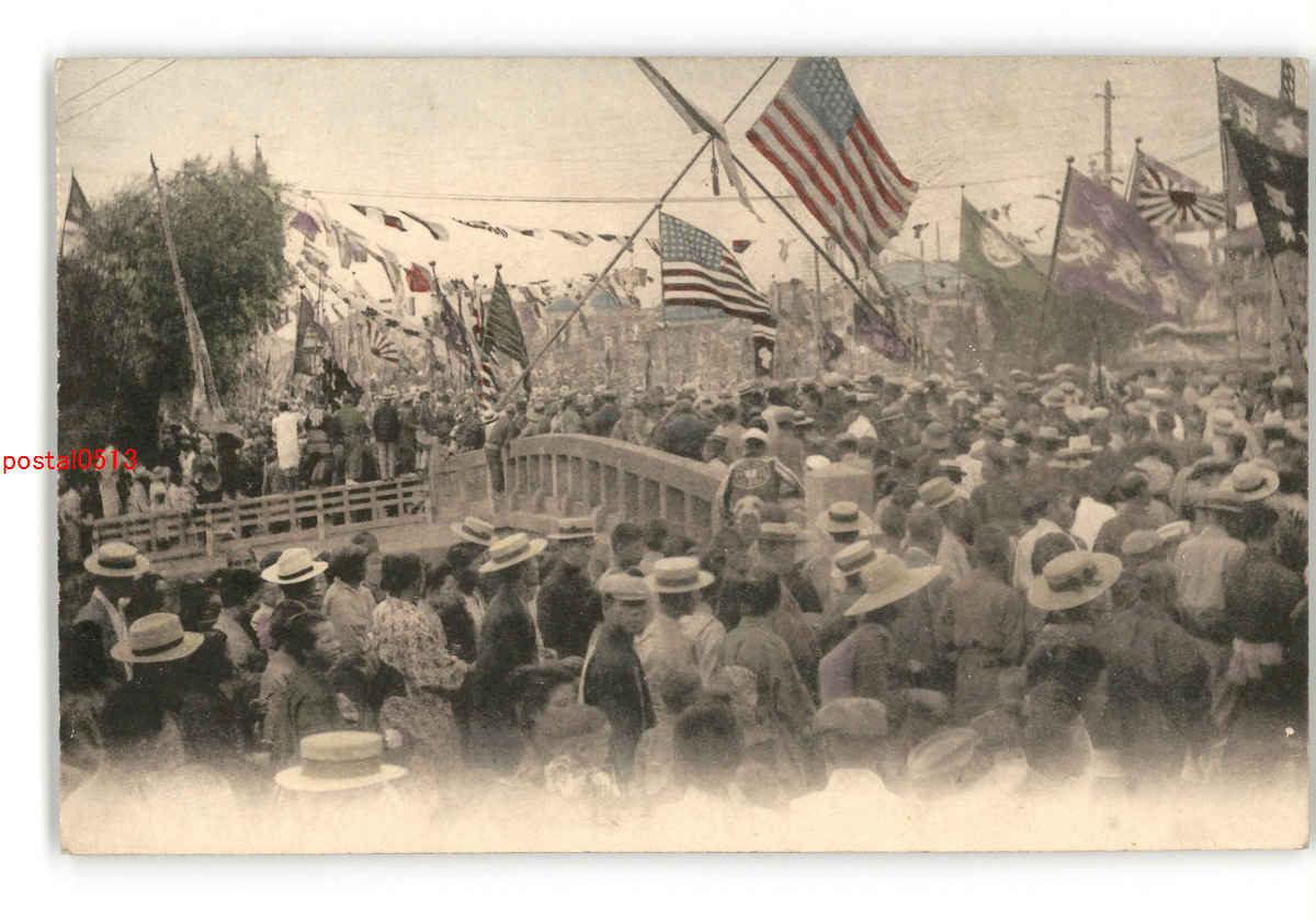 アメリカ艦隊歓迎の雑踏? 手彩色 危険な場所に立って見物 *傷み有り