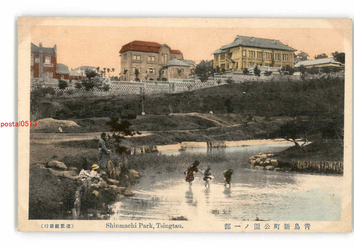 満州 手彩色 青島新町公園の一部 *傷み有り