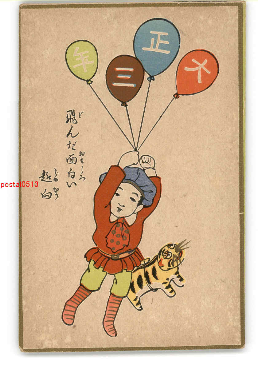年賀状アート絵葉書 風船を持つ子供 寅 *傷み有り
